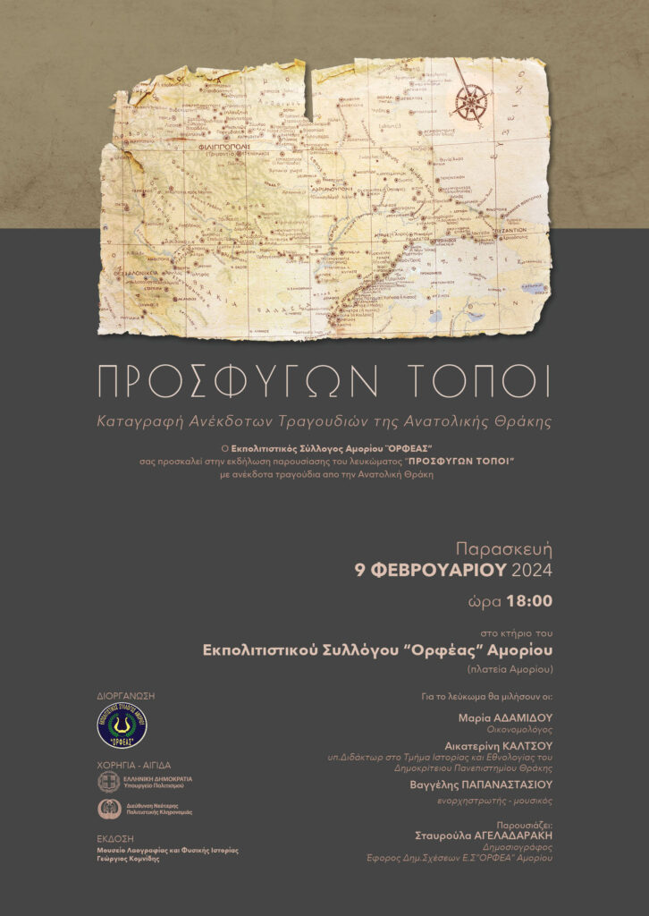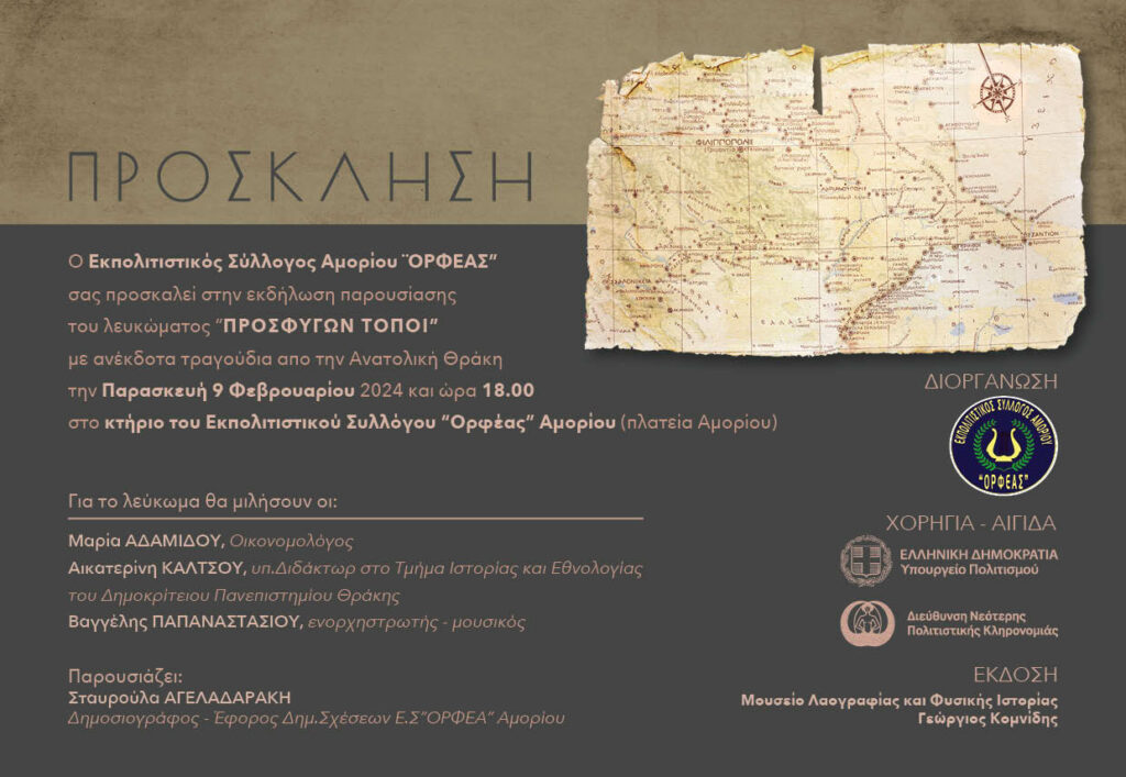 Ο Εκπολιτιστικός Σύλλογος «ΟΡΦΕΑΣ» Αμορίου σας προσκαλεί στην εκδήλωση παρουσίασης του λευκώματος ΠΡΟΣΦΥΓΩΝ ΤΟΠΟΙ με ανέκδοτα τραγούδια από την Ανατολική Θράκη