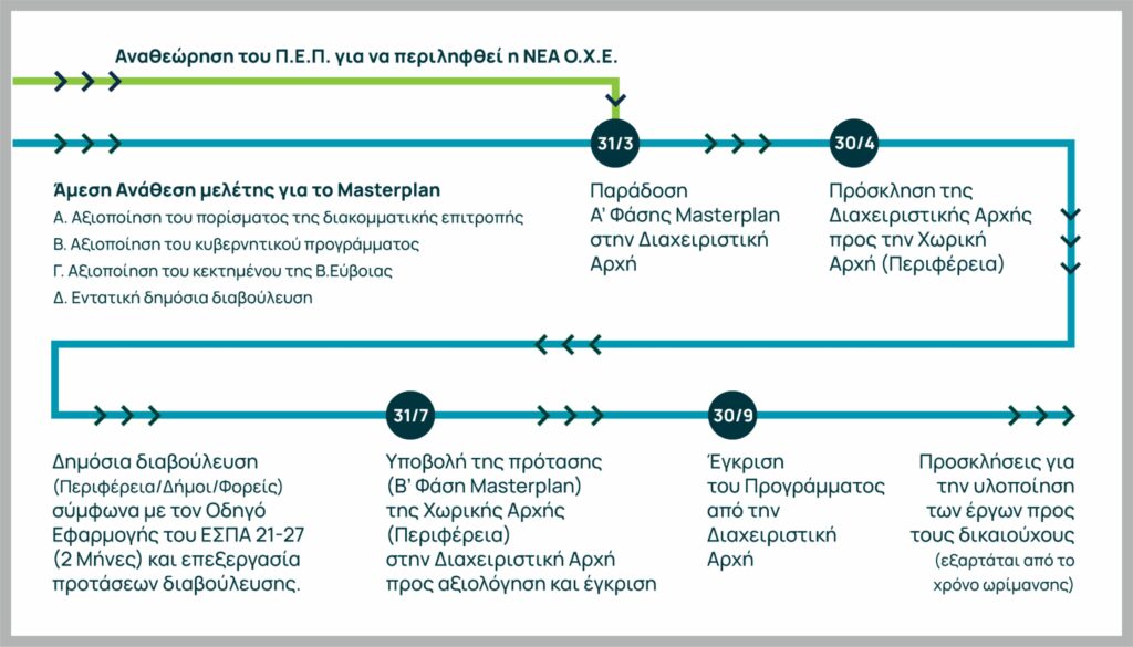 Σύμφωνα με το χρονοδιάγραμμα, σε λίγες μέρες, και συγκεκριμένα στις 31 Μαρτίου, η Επιτροπή πρέπει να παραδώσει την πρώτη φάση του master plan στη Διαχειριστική Αρχή, ώστε ένα μήνα αργότερα (30/4) η Διαχειριστική Αρχή να προχωρήσει στην Πρόσκληση προς την Περιφέρεια, να ακολουθήσει δίμηνη δημόσια διαβούλευση, στις 31/7 να υποβληθεί η ολοκληρωμένη πρόταση (β΄ φάση του master plan) από την Περιφέρεια ΑΜΘ στη Διαχειριστική Αρχή και μετά από δύο μήνες επεξεργασία και αξιολόγηση, στις 30 Σεπτεμβρίου 2024 εν τέλει να εγκριθεί το Πρόγραμμα και να αρχίσουν να δημοσιεύονται Προσκλήσεις προς τους δικαιούχους για την υλοποίηση των έργων, ανάλογα με το χρόνο ωρίμανσης του καθενός.