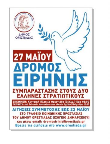 Στο πλαίσιο διοργάνωσης από το Δήμο Ορεστιάδας δρόμου «Ειρήνης» στις 27 Μάϊου 2018 ως ένα μήνυμα συμπαράστασης στους δύο Έλληνες στρατιωτικούς, ορίζεται αφετηρία η Κεντρική Πλατεία Ορεστιάδα και παρατίθεται αναλυτικά το πρόγραμμα: