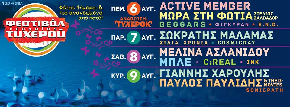 H καρδιά της ελληνικής μουσικής σκηνής θα χτυπήσει δυνατά στις 6, 7 ,8 και 9 Αυγούστου 2015 στο Τυχερό, το οποίο ετοιμάζεται να υποδεχθεί το 13ο Φεστιβάλ Νεολαίας με ένα μουσικό πρόγραμμα το οποίο ξεπερνά τα δεδομένα κάθε προηγούμενης χρονιάς σε ρυθμούς Ηip hop, pop, rock και νεανική μουσική.