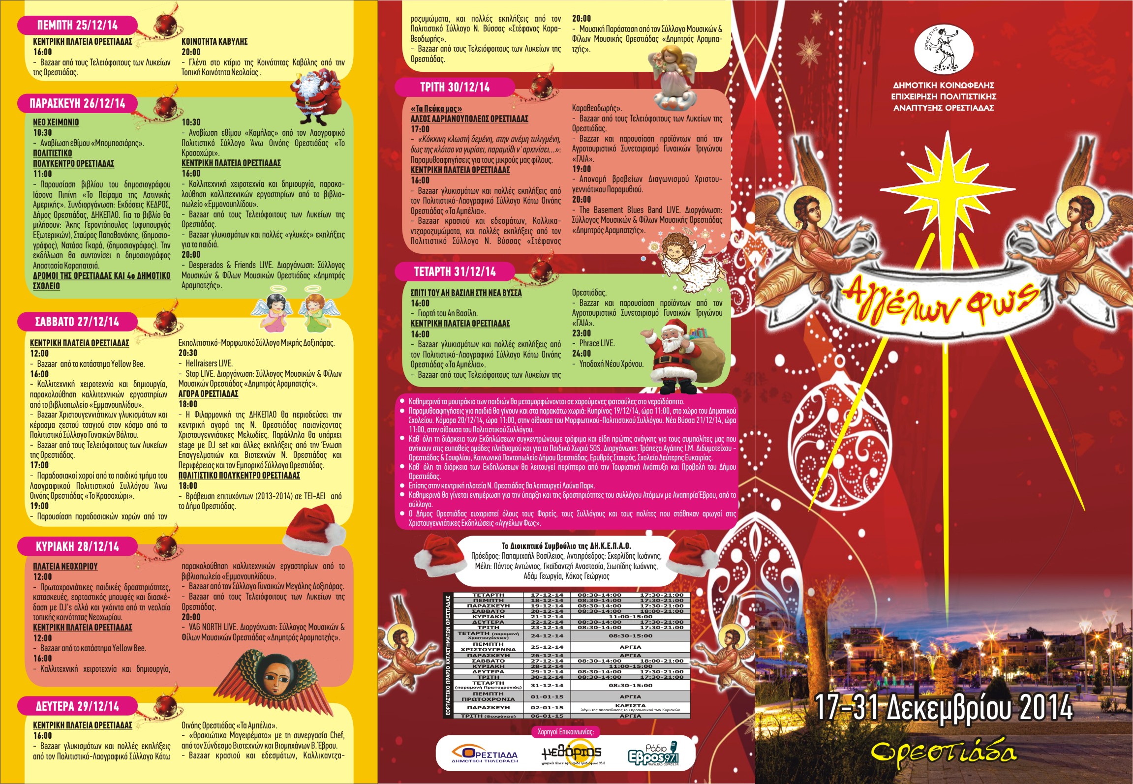 - Η Φιλαρμονική της ΔΗΚΕΠΑΟ θα περιοδεύσει την κεντρική αγορά της Ν. Ορεστιάδας παιανίζοντας Χριστουγεννιάτικες Μελωδίες. Παράλληλα θα υπάρχει stage με DJset και άλλες εκπλήξεις από την Ένωση Επαγγελματιών και Βιοτεχνών Ν. Ορεστιάδας και Περιφέρειας και τον Εμπορικό Σύλλογο Ορεστιάδας.