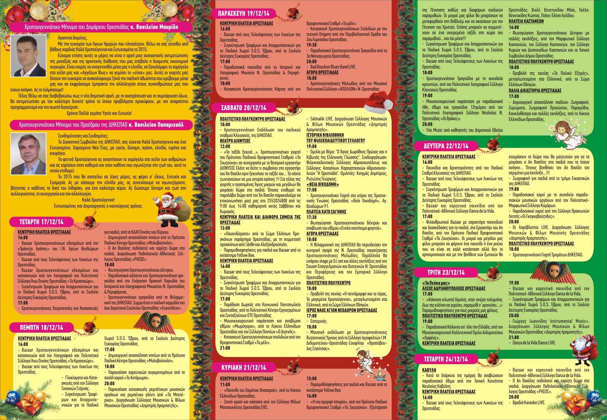 - Η Φιλαρμονική της ΔΗΚΕΠΑΟ θα περιοδεύσει την κεντρική αγορά της Ν. Ορεστιάδας παιανίζοντας Χριστουγεννιάτικες Μελωδίες.. Παράλληλα θα υπάρχει stage με DJset και άλλες εκπλήξεις από την Ένωση Επαγγελματιών και Βιοτεχνών Ν. Ορεστιάδας και Περιφέρειας και τον Εμπορικό Σύλλογο Ορεστιάδας.