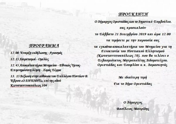 Πιο συγκεκριμένα ο Δήμαρχος Ορεστιάδας μέσω πρόσκλησης καλεί τον κόσμο να τιμήσει με την παρουσία του (στην οδό Κωνσταντινουπόλεως 70) τα εγκαίνια – αποκαλυπτήρια του Μνημείου για τη Γενοκτονία του Ποντιακού Ελληνισμού που θα τελέσει ο Σεβασμιότατος Μητροπολίτης Διδυμοτείχου, Ορεστιάδας και Σουφλίου κ.κ Δαμασκηνός.