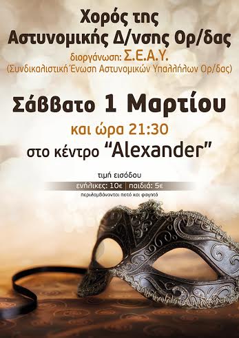 Το Σάββατο 1 Μαρτίου θα πραγματοποιηθεί ο χορός της Αστυνομικής Διεύθυνσης Ορεστιάδας στο κέντρο διασκέδασης “Alexander” στις 21:30.Η τιμή εισόδου είναι 10€ για ενήλικες και 5€ για παιδιά και συμπεριλαμβάνονται φαγητό και ποτό.Την εκδήλωση διοργανώνει η Σ.Ε.Α.Υ (Συνδικαλιστική Ένωση Αστυνομικών Υπαλλήλων Ορεστιάδας)