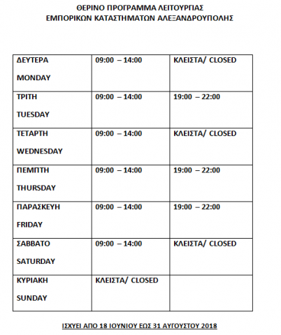 Από την Δευτέρα 18 Ιουνίου μέχρι και την Παρασκευή 31 Αυγούστου θα διαρκέσει το θερινό ωράριο των εμπορικών καταστημάτων του κέντρου της Αλεξανδρούπολης όπως ανακοίνωσε ο Εμπορικός Σύλλογος της πόλης: