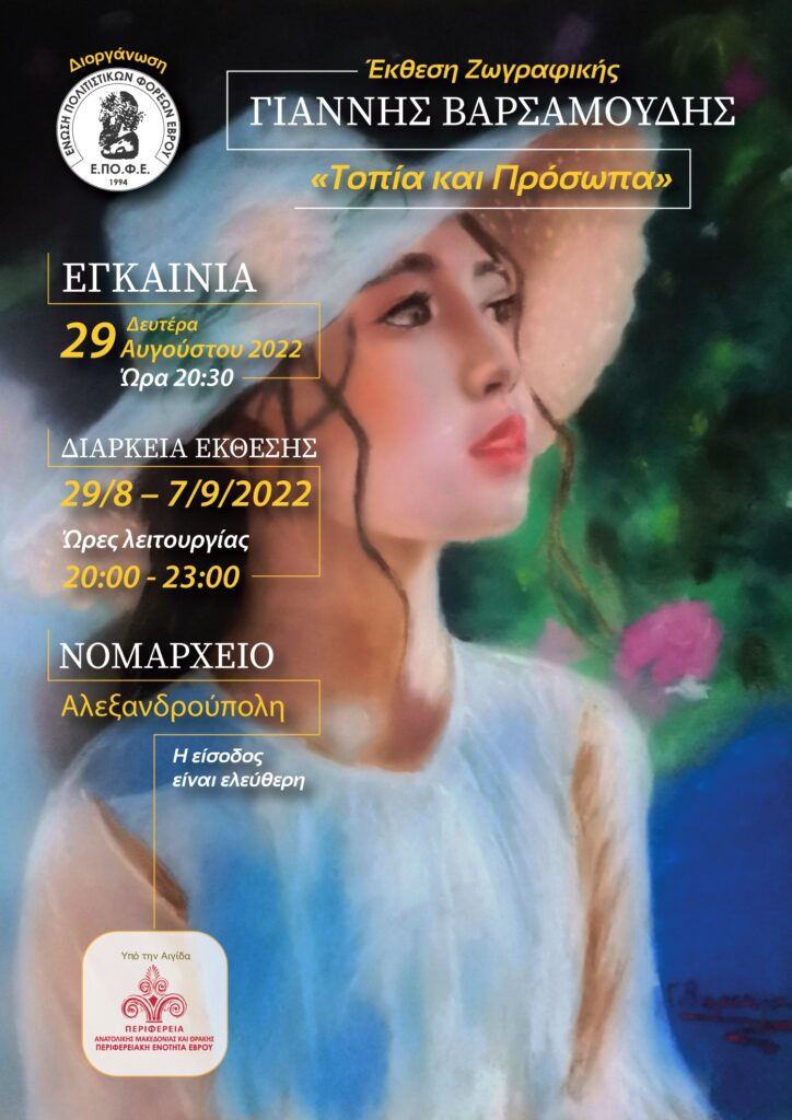 Η Ένωση Πολιτιστικών Φορέων Έβρου (Ε.ΠΟ.Φ.Ε.) σας προσκαλεί να τιμήσετε με την παρουσία σας τα εγκαίνια της Έκθεσης Ζωγραφικής του καλλιτέχνη Γιάννη Βαρσαμούδη με θεματογραφία «Τοπία και Πρόσωπα» τη Δευτέρα 29 Αυγούστου 2022 και ώρα 20:30 στο Νομαρχείο, Αλεξανδρούπολη