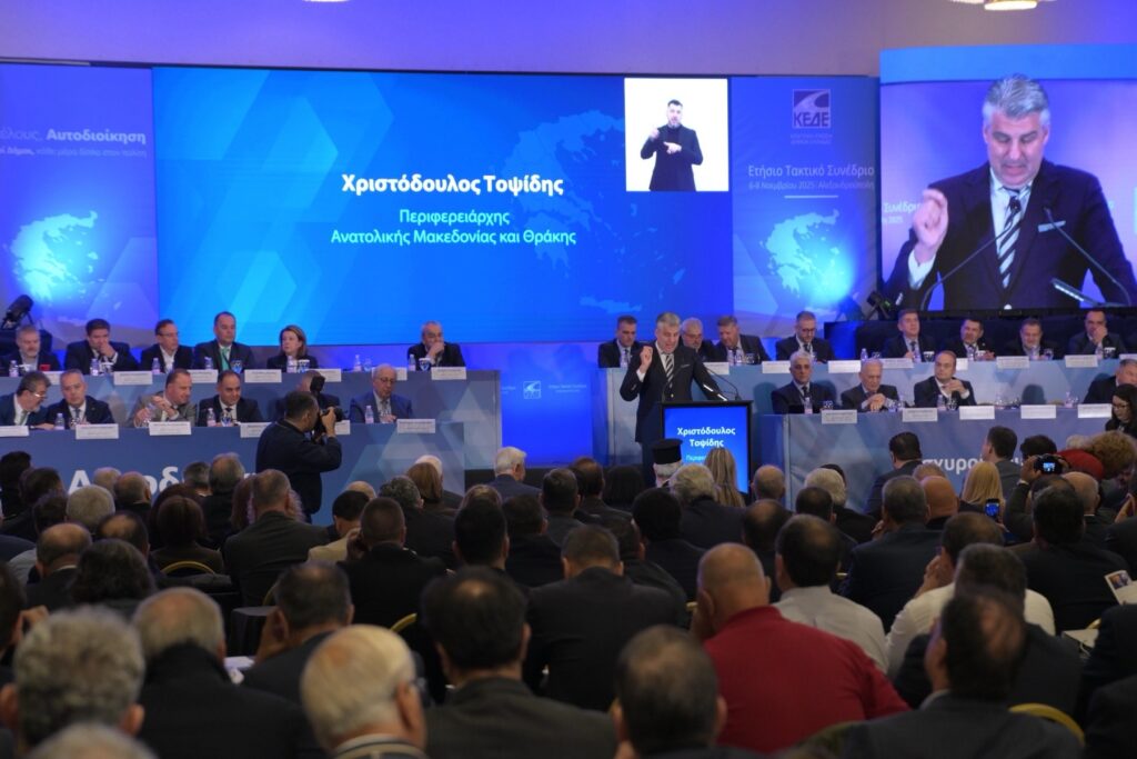 Στην εναρκτήρια συνεδρίαση του συνεδρίου της Κεντρικής Ένωσης Δήμων Ελλάδας (ΚΕΔΕ), που ξεκίνησε τις εργασίες του σήμερα, Πέμπτη 6 Νοεμβρίου 2025, στην Αλεξανδρούπολη, παρουσία του Υπουργού Εσωτερικών κ. Θοδωρή Λιβάνιου, του υφυπουργού παρά τω Πρωθυπουργώ κ. Θανάση Κοντογεώργη, των υφυπουργών Εσωτερικών κ. Βασίλειου Σπανάκη και Κων. Γκιουλέκα (αρμόδιος για θέματα Μακεδονίας-Θράκης), απηύθυνε χαιρετισμό ο Περιφερειάρχης Ανατολικής Μακεδονίας και Θράκης κ. Χριστόδουλος Τοψίδης, εκπροσωπώντας και την Ένωση Περιφερειών Ελλάδας.