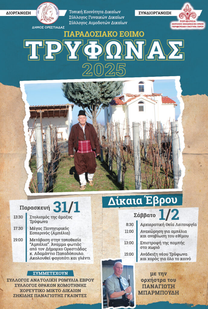 Ο Δήμος Ορεστιάδας σε συνδιοργάνωση με την Περιφέρεια Ανατολικής Μακεδονίας Θράκης, την τοπική Κοινότητα Δικαίων, το Σύλλογο Γυναικών Δικαίων, τον Σύλλογο Δικαίων αιμοδοτών, θα προβούν στην αναβίωση του παραδοσιακού εθίμου του Αγίου Τρύφωνα προστάτη των αμπελουργών. Η εκδήλωση «Τρύφωνας 2025» γίνεται προς τιμήν του Αγίου Τρύφωνα, με αγιασμό των αμπελιών για αφθονία , και στόχο έχει την αναβίωση και διάσωση του εθίμου που υφίσταται εδώ και 100 χρόνια.