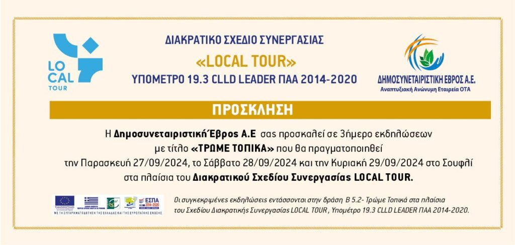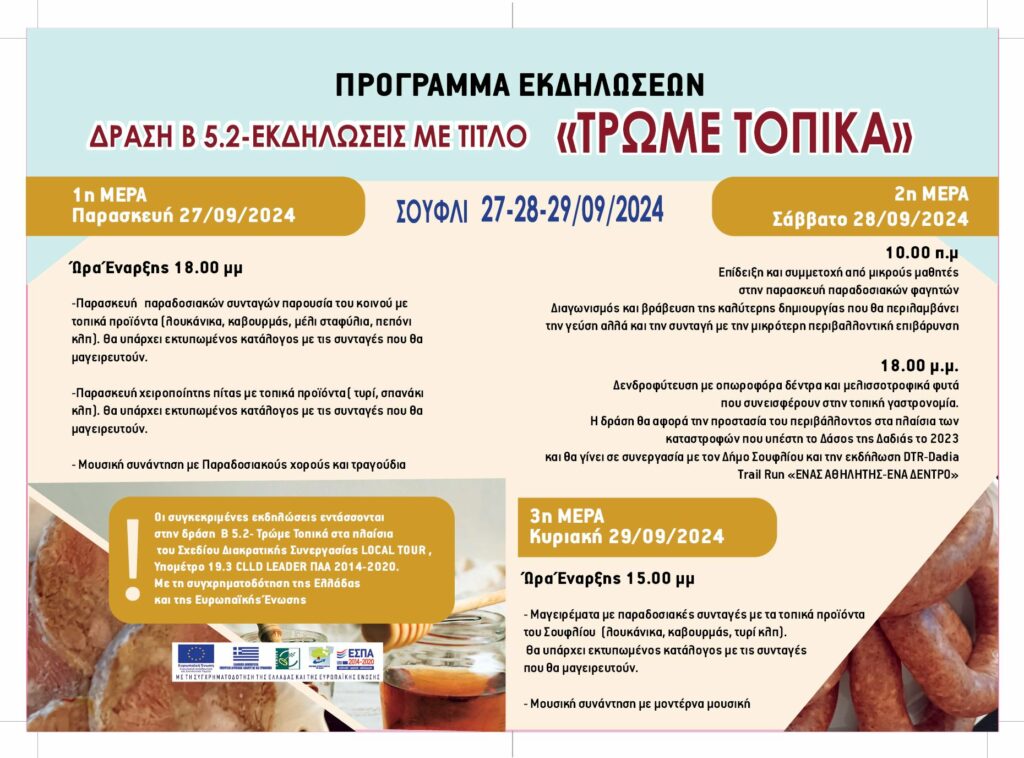 Τριήμερο εκδηλώσεων με τίτλο ”ΤΡΩΜΕ ΤΟΠΙΚΑ” θα πραγματοποιηθεί στο Σουφλί στα πλαίσια του Διακρατικού Σχεδίου Συνεργασίας LOCAL TOUR.