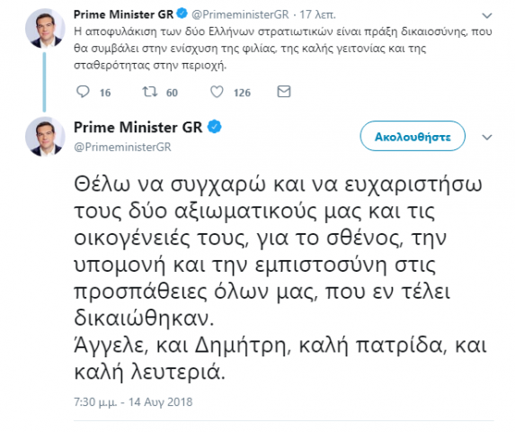 Νεότερη ενημέρωση 19:50: Ο πρωθυπουργός επιβεβαίωσε την απελευθέρωση των δύο Ελλήνων στρατιωτικών με μήνυμα στο twitter: