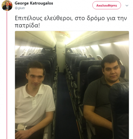 Νεότερη ενημέρωση 02:36: Φωτογραφία των δύο Ελλήνων στρατιωτικών μέσα από το πρωθυπουργικό αεροσκάφος δημοσίευσε ο Γιώργος Κατρούγκαλος: