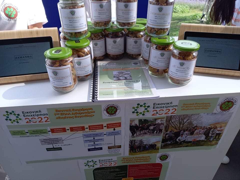 Η έκθεση των προϊόντων της Ανώνυμης (εικονικής) Εταιρίας “Ζωομπουκίτσες Έβρου” στήθηκε στο θόλο του Κέντρου Πολιτισμού Σταύρος Νιάρχος και εκεί περίμεναν τους επισκέπτες τους οι μικροί “επιχειρηματίες” για να τους κάνουν γνωστή τη δημιουργική δραστηριότητα που αναπτύσσουν στο Διδυμότειχό τους και στο σχολείο τους. Πράγματι, η επισκεψιμότητα υπήρξε μεγάλη, με τους χορηγούς σε πρώτο πλάνο στα τάμπλετ του σχολείου και το πλήθος σε συνεχή ροή. Μάλιστα από το ξεκίνημα έχουν, λέει, λάβει παραγγελίες για αποστολή προϊόντων! Μεταξύ άλλων, επισκέφθηκαν το περίπτερο των μαθητών η κ. Γιάννα Αγγελοπουλου-Δασκαλάκη, η πρόεδρος του Ελληνικού Οργανισμού Τουρισμού κ. Άντζελα Γκερέκου, ο υφυπουργός Ανάπτυξης κ. Χρίστος Δήμας, ο υφυπουργός Παιδείας κ. Άγγελος Συρίγος, έως και το συνεργείο της ΕΡΤ που πήρε συνέντευξη από τα παιδιά και τους καθηγητές.