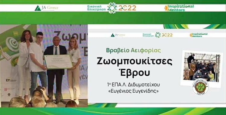 Στο επιστέγασμα όλων αυτών, την Παρασκευή 13 Μαΐου ήρθε και η επιβράβευση κατά τη διάρκεια της εκδήλωσης απονομής: Βραβείο Αειφορίας στην εικονική επιχείρηση “Ζωομπουκίτσες Έβρου Α.Ε.” με χαμόγελα χαράς, ικανοποίησης και επιβεβαίωσης σε όλους, ότι η απαιτητική αυτή πορεία που χάραξαν παρέα μαθητές και καθηγητές σε εποχή δύσκολη με κορονοϊούς, τηλεκπαιδεύσεις, μαθήματα, ύλη, θέματα κι εξετάσεις, θα αποτελεί μια εμπειρία ζωής που θα τους ακολουθεί.