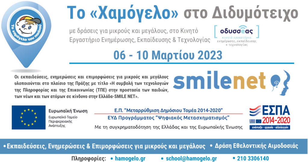 Οι εκπαιδεύσεις, ενημερώσεις και επιμορφώσεις για μικρούς και μεγάλους υλοποιούνται στο πλαίσιο της Πράξης με τίτλο «Η συμβολή των τεχνολογιών της Πληροφορίας και της Επικοινωνίας (ΤΠΕ) στην προστασία των παιδιών, των νέων και των ατόμων σε κίνδυνο στην Ελλάδα-SMILE NET» η οποία εντάσσεται στο Επιχειρησιακό Πρόγραμμα «Μεταρρύθμιση Δημοσίου Τομέα 2014-2020» με MIS 5129741. «Το Χαμόγελο του Παιδιού» μέσω του έργου «SMILE NET» στοχεύει στην προστασία παιδιών σε κίνδυνο, καθώς και ατόμων από 18 έως 60 ετών που ανήκουν σε ομάδες υψηλού κινδύνου στην Ελλάδα, συμπεριλαμβανομένων των προσφύγων και των μεταναστών, μέσω τεσσάρων Υποέργων που αξιοποιούν την τεχνολογική καινοτομία.