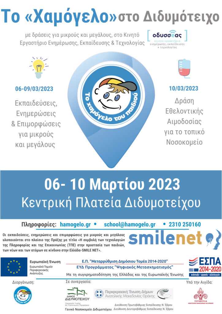 Από τη Δευτέρα 6 έως και την Παρασκευή 10 Μαρτίου 2023, το Κινητό Εργαστήριο Ενημέρωσης, Εκπαίδευσης & Τεχνολογίας «ΟΔΥΣΣΕΑΣ» από τον Οργανισμό «Το Χαμόγελο του Παιδιού» θα βρίσκεται στο Διδυμότειχο (Κεντρική Πλατεία, μπροστά από το Τέμενος Βαγιαζήτ), για να υλοποιήσει δωρεάν εκπαιδευτικές δράσεις πρόληψης για μικρούς και μεγάλους, σε κρίσιμους τομείς που αφορούν τη ζωή και τα δικαιώματα των παιδιών, καθώς επίσης δράση εθελοντικής αιμοδοσίας για την ενίσχυση των αποθεμάτων αίματος του Γενικού Νοσοκομείου Διδυμοτείχου.