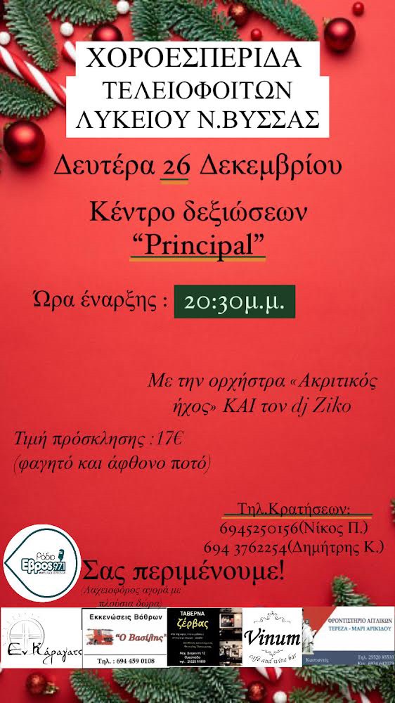 Η χοροεσπερίδα θα πραγματοποιηθεί τη Δευτέρα 26 Δεκεμβρίου στο Κέντρο Δεξιώσεων Principal και τη μουσική επιμέλεια της βραδιάς θα επιμεληθεί η ορχήστρα «Ακριτικός Ήχος» και ο Dj Zikos.