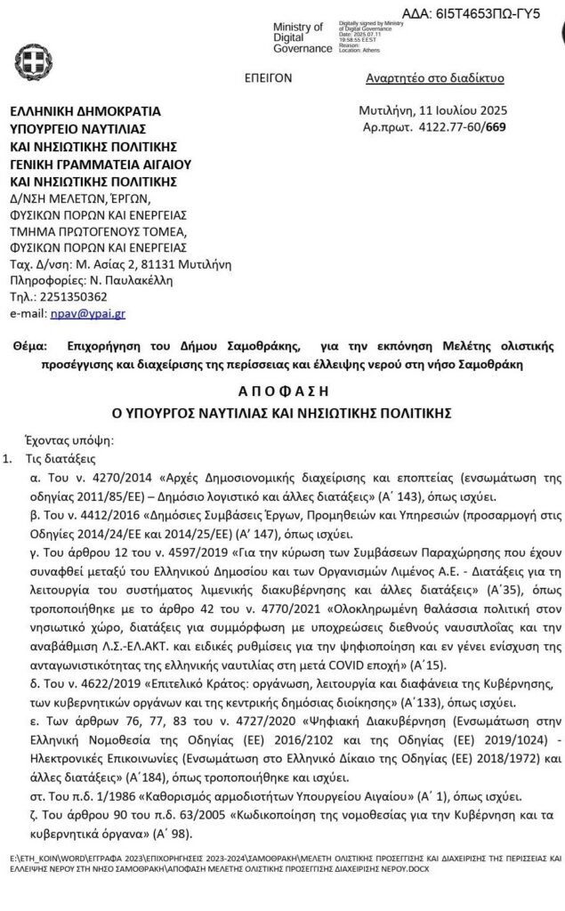 Η μελέτη, με τίτλο «Ολιστική προσέγγιση και διαχείριση της περίσσειας και έλλειψης πόσιμου νερού στη νήσο Σαμοθράκη», στοχεύει στην επιστημονική τεκμηρίωση και την ορθολογική αντιμετώπιση των προκλήσεων που σχετίζονται με τη διαχείριση των υδάτινων πόρων του νησιού.