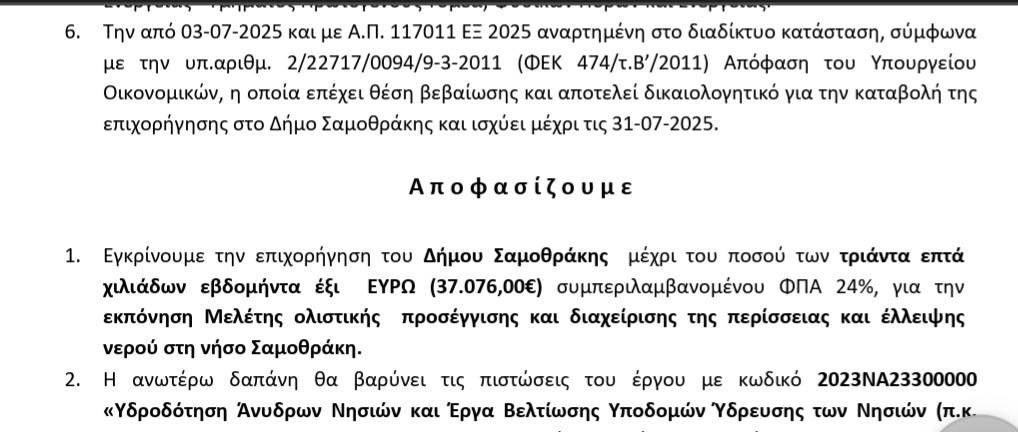 Σημαντικό βήμα για την επίλυση των προβλημάτων διαχείρισης του πόσιμου νερού στη Σαμοθράκη πραγματοποιείται με τη χρηματοδότηση της εκπόνησης σχετικής μελέτης, ύψους 37.076 ευρώ, από τη Γενική Γραμματεία Νησιωτικής Πολιτικής.