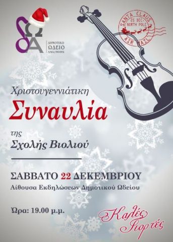 - Σάββατο 22 Δεκεμβρίου 2018 και ώρα 7:00 μ.μ. συναυλία της Σχολής Βιολιού, με ένα πλούσιο ρεπερτόριο για σόλο εμφανίσεις και σύνολα.