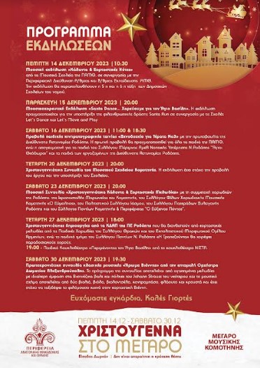 «Χριστούγεννα στο Μέγαρο 2023»: Υποδεχόμαστε τα Χριστούγεννα με εορταστικές εκδηλώσεις που θα ενθουσιάσουν μικρούς και μεγάλους, τις οποίες διοργανώνει η Περιφέρεια Ανατολικής Μακεδονίας και Θράκης στο Μέγαρο Μουσικής Κομοτηνής.