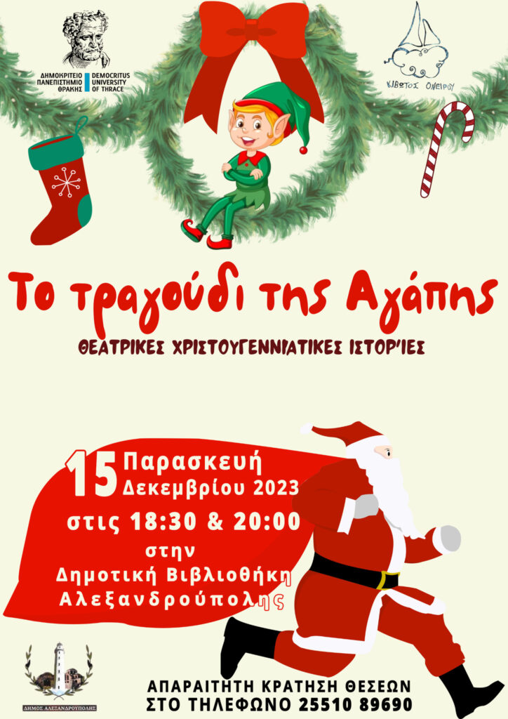 Η θεατρική ομάδα «Κιβωτός ονείρου» του Τμήματος Επιστημών της Εκπαίδευσης στην Προσχολική Ηλικία της Σχολής Επιστημών Αγωγής του Δημοκρίτειου Πανεπιστημίου Θράκης, παρουσιάζει Χριστουγεννιάτικα δρώμενα για παιδιά με τίτλο «Το τραγούδι της αγάπης».