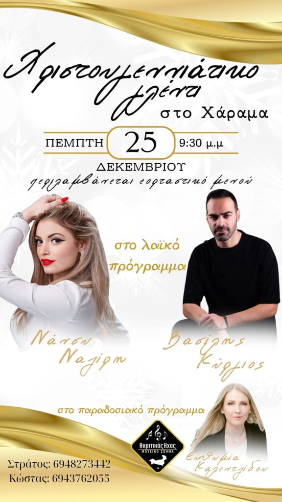 Η Ταβέρνα «Το Χάραμα» σας περιμένει για ένα μοναδικό χριστουγεννιάτικο γλέντι την Πέμπτη 25 Δεκεμβρίου 2025, ανήμερα των Χριστουγέννων, από τις 9:30 το βράδυ.